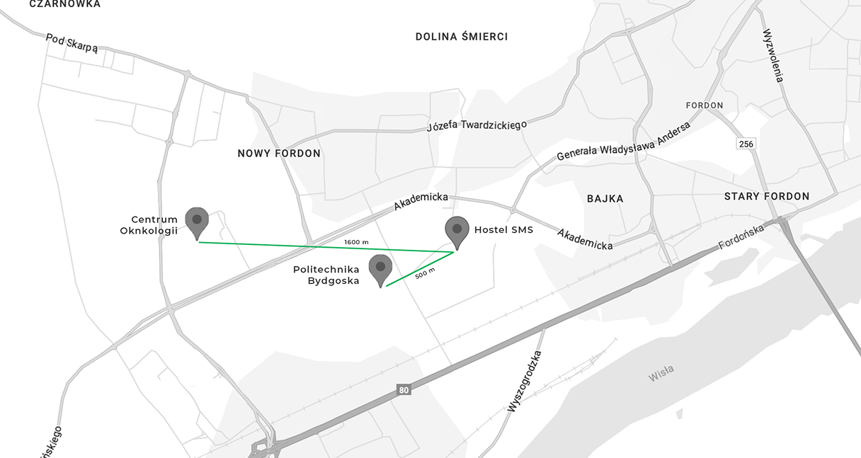 Hostel SMS znajduje się przy ul. Igrzyskowej 10A w bydgoskim Fordonie — w spokojnej okolicy z wygodnym dojazdem do najważniejszych punktów miasta.